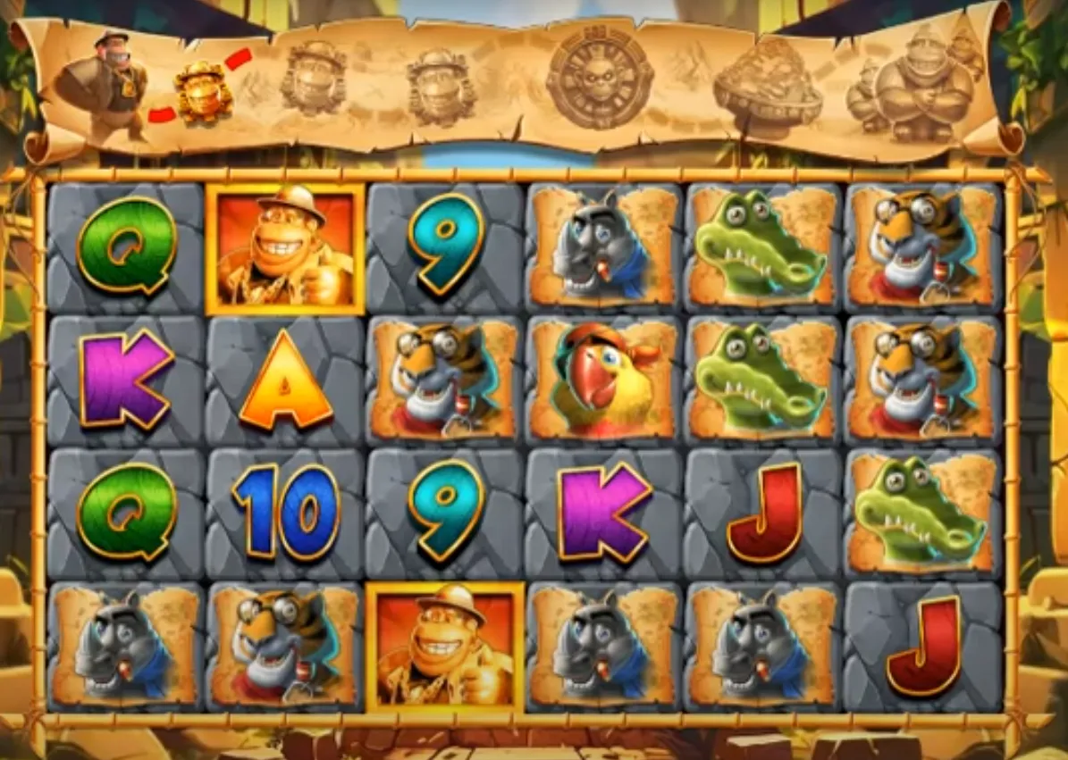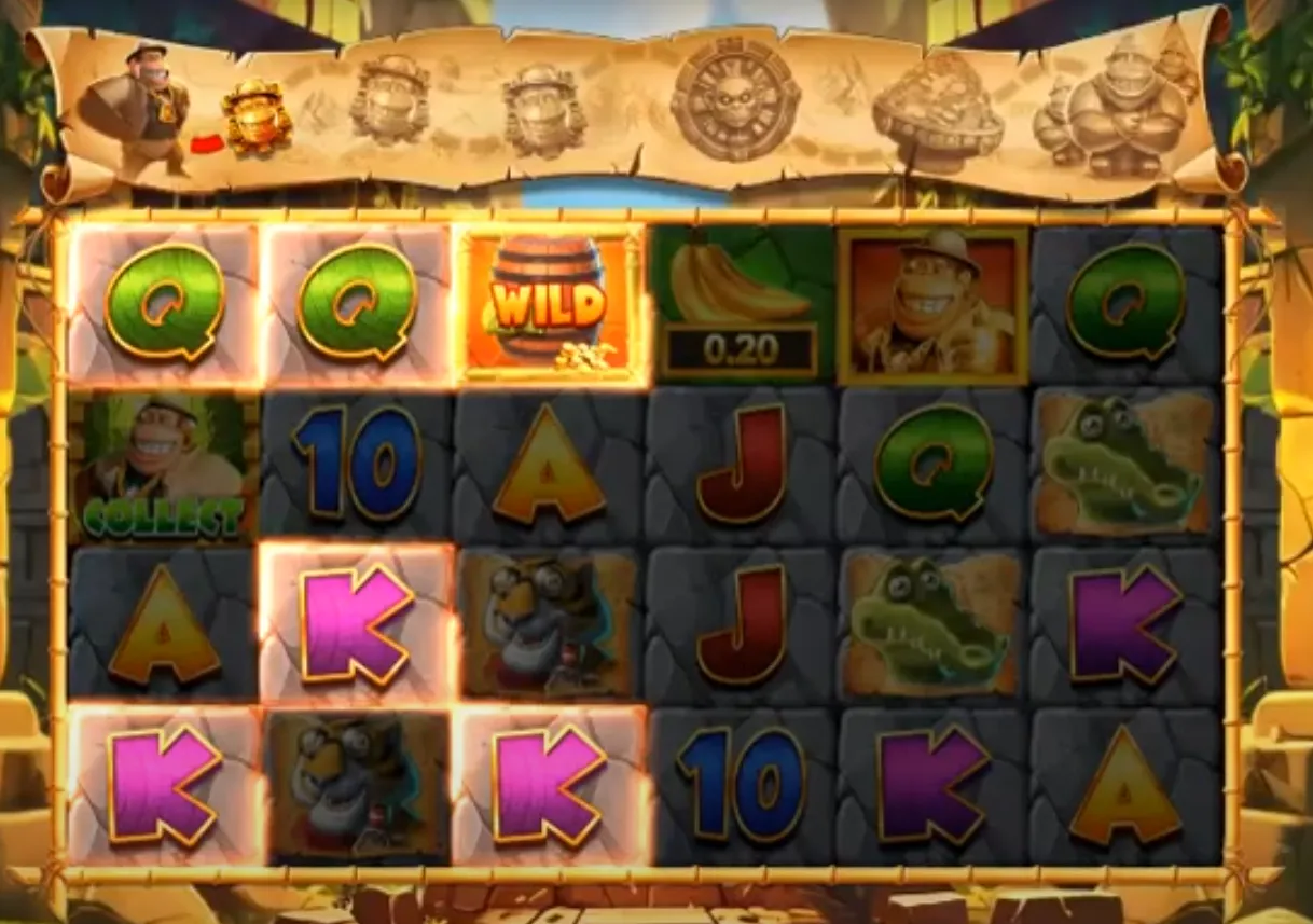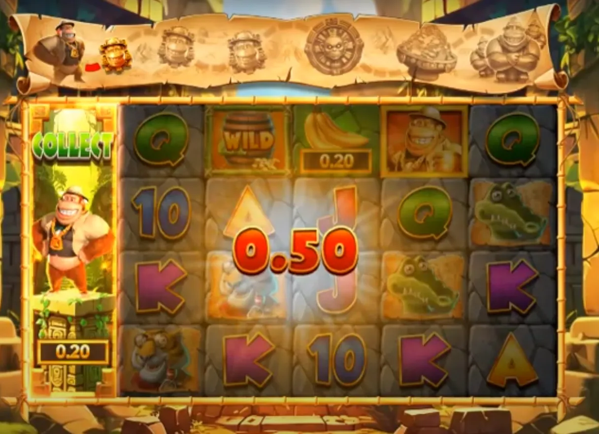 Collect Symbols (Kong, Rhino, Tiger, Parrot): Initially, only the Kong Collect symbol is active, but as you progress, Rhino, Tiger, and Parrot Collect symbols can be unlocked. When a Collect symbol lands on reel 1 or 6 alongside any Cash Prize symbols, it expands and collects all visible cash values for an instant payout. These symbols also advance your progress on the bonus trail, unlocking further features.